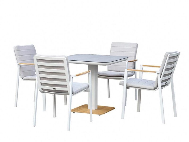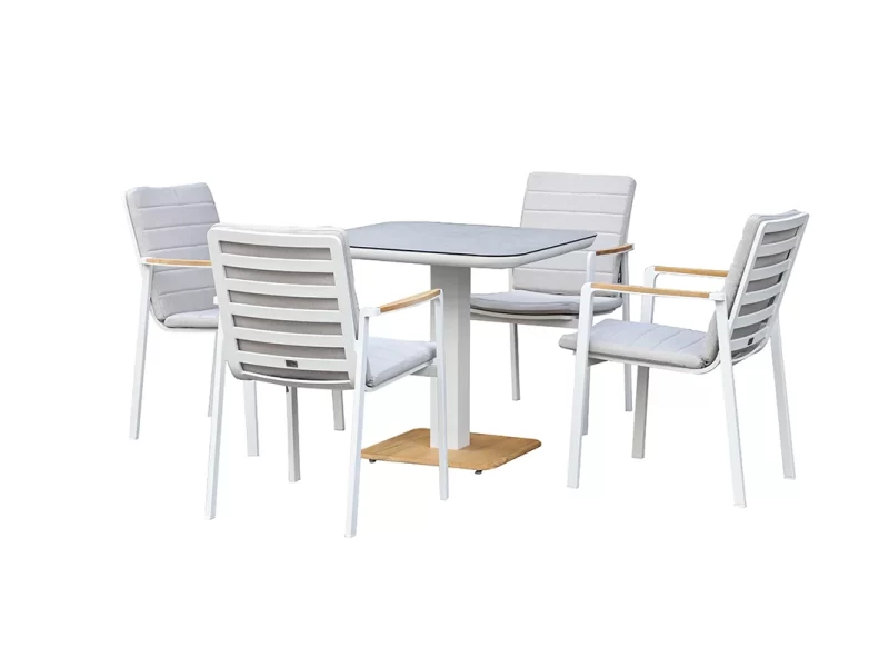 The Ancona Bistro Set offers the perfect combination of style, durability, and comfort. Its Aluminum Frame, Power Coating Finish, and thermal cover on the top give it a unique teak wood look that is both appealing and charming. The polyester cushions and high back rests of the dining chairs ensure ultimate comfort, making it the ultimate choice for outdoor dining. The Ancona Bistro Set is a must-have for anyone looking to elevate their outdoor dining experience.