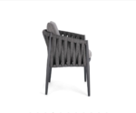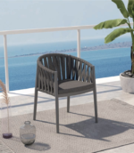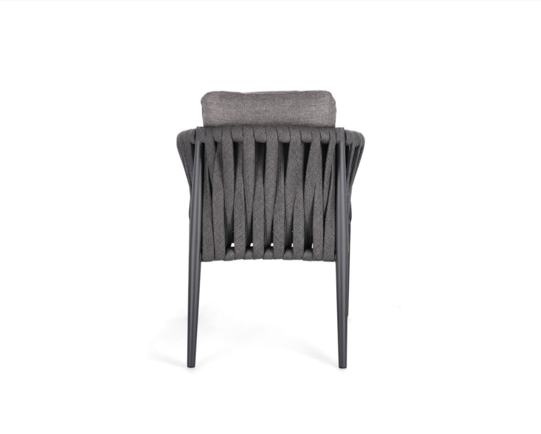 The gently curved rope detailing provides both visual texture and supportive comfort, while the generously padded seat and back cushions ensure a relaxed dining experience. Its clean silhouette and neutral tone make it versatile for a wide range of outdoor dining settings, from modern terraces to elegant garden spaces.