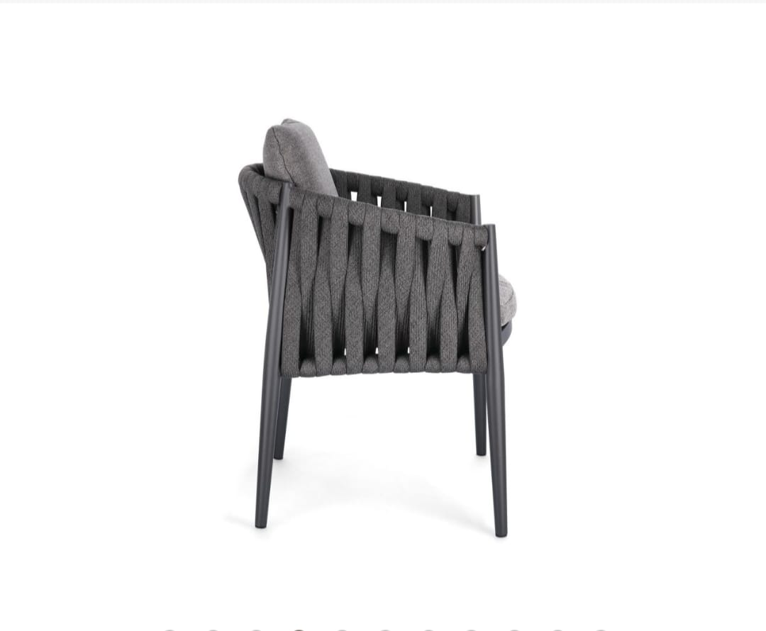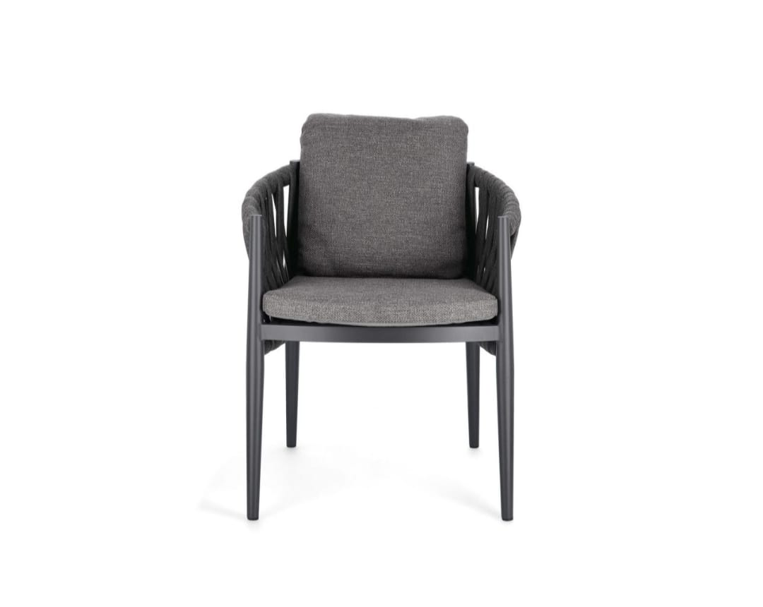 The Berlin Dining Chair is a refined expression of contemporary outdoor design, combining comfort, durability, and understated elegance. Designed to complement the Berlin dining and lounge collections, this chair features a sleek aluminium frame paired with expertly woven polypropylene rope in a sophisticated charcoal finish.