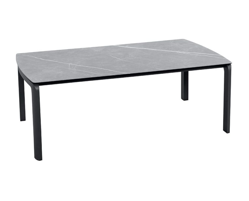 The chic coffee table features a sturdy aluminum frame and is adorned with a sophisticated grey marble finish spray stone glass top, providing a touch of texture and elegance.