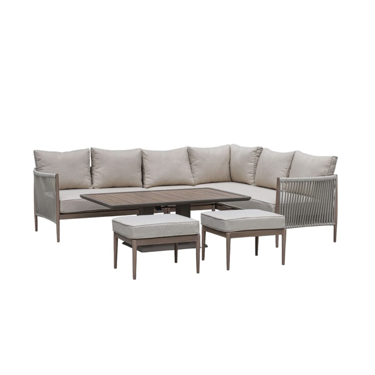 The Roma Corner Sofa Set is designed to transform your outdoor space into an inviting sanctuary for friends and family. The spacious sofa features a robust aluminium frame wrapped in a warm wood-effect finish, offering the natural beauty of wood without the upkeep. This frame is elegantly wrapped in all-weather rope in a sophisticated natural tone, paired with plush cream cushions for a luxurious touch. Its modern, laid-back design epitomizes luxury and comfort.