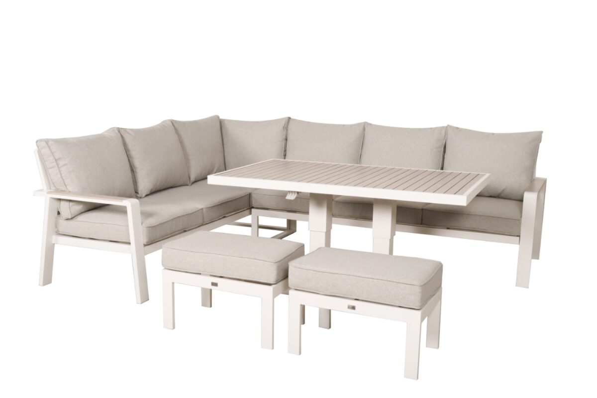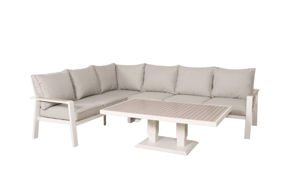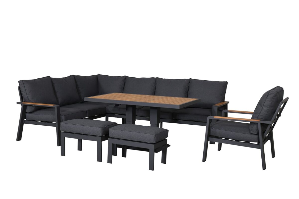 The standout feature of the Sicily Corner Set is its adjustable coffee table, which effortlessly transforms into a dining table. Whether you’re entertaining guests or enjoying a quiet meal, the table’s lift function allows you to customize the height to suit any occasion. The table is crafted from powder-coated aluminum with a thermal wood-look print, combining modern aesthetics with durability.